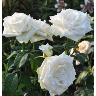 Оригинальное название «Боинг» прекрасно отражает внешний вид бутонов, которые своей вытянутой формой напоминают стремительные белоснежные лайнеры на фоне темно-зеленой листвы. Полураскидистые мощные кусты достигают высоты от 80 до 120 см и в диаметре составляют 70-90 см. Идеально ровные прямые побеги покрыты глянцевой темно-зеленой листвой, края которой украшены мелкими зазубринами. На листовой пластине четко видны центральная и боковые жилки, а изнаночная сторона слегка светлее лицевой.